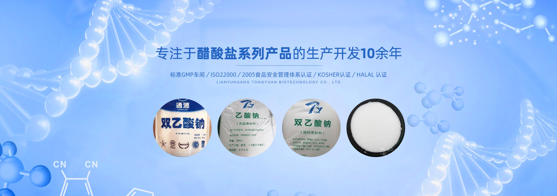 連云港市通源生物科技有限公司 是生產雙乙酸鈉、無水醋酸鈉、三水醋酸鈉、醋酸鉀、乙酸鈉、丙酸鈉、丙酸鈣和氯化鉀等系類醋酸鹽產品的專業制造商。公司專注于醋酸鹽系列產品的生產開發10余年,是國內專業醋酸酸鹽產品生產基地。 目前,我們已和全球30多個國家和地區建立長期的業務合作關系,是中國較大的雙乙酸鈉生產商和出口商之一。作為中國食品添加劑和配料協會理事單位,通源公司已建成標準GMP車間5000余平方米,通過了ISO22000:2005食品安全管理體系認證、KOSHER認證、HALAL 認證等,這些都是我們提供高質量產品和優良服務的前提和確保。 生產出色產品,提供優良服務,滿足顧客需要,是我們努力的目標。愿和我們的朋友們攜手,共...